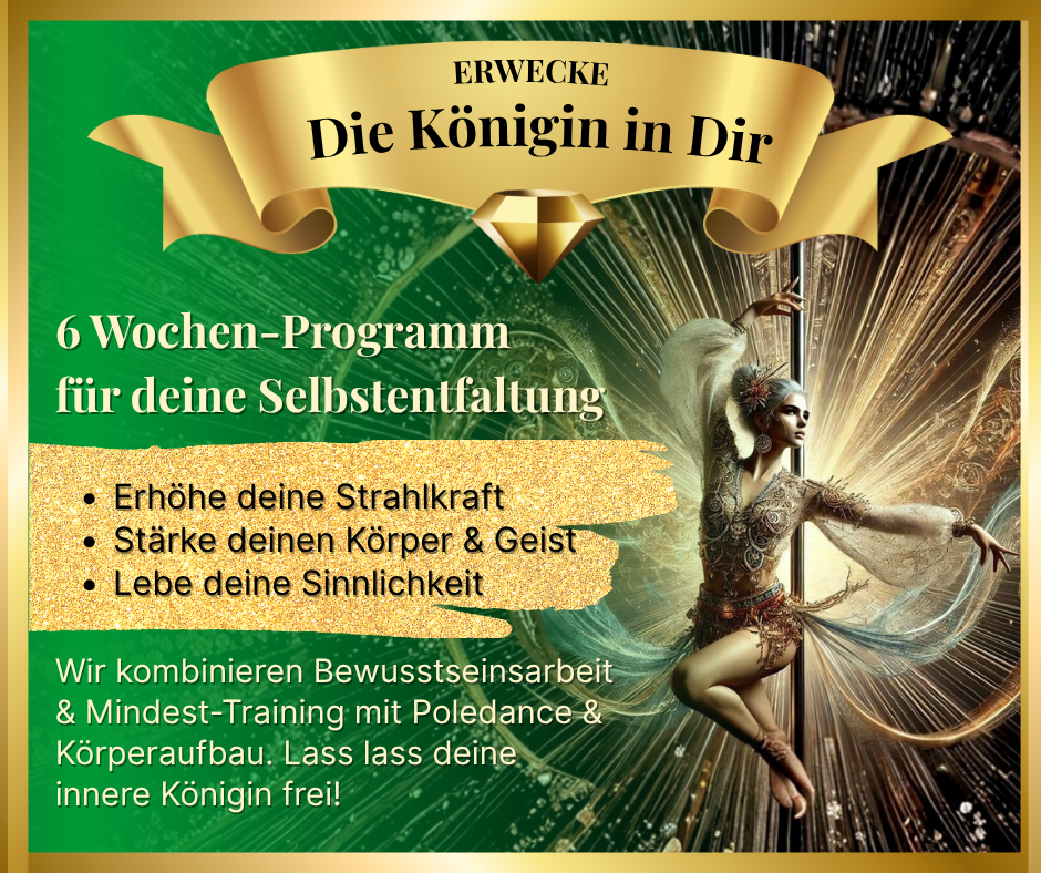In diesem Programm kombinieren wir Bewusstseinsarbeit, Mindest-Training und Poledance mit körperaufbauendem Training. Hol dir die Aspekte deiner Weiblichkeit zurück und erfahre dich selbst neu! Diese einzigartige Kombination holt dich genau da ab, wo du gerade bist und hilft dir deinen Selbstwert, deine Strahlkraft und dein Selbstvertrauen zu stärken.